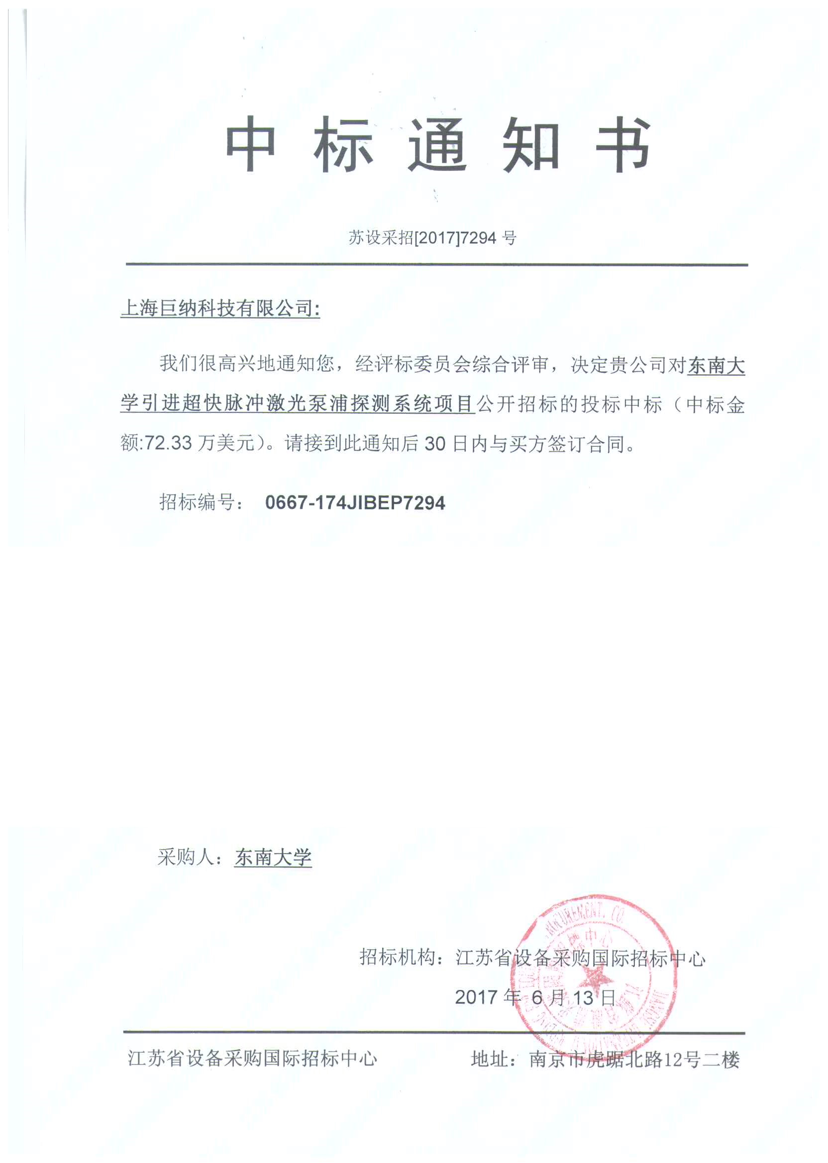 【中標通知】上海巨納中標東南大學(xué)超快脈沖激光泵浦探測系