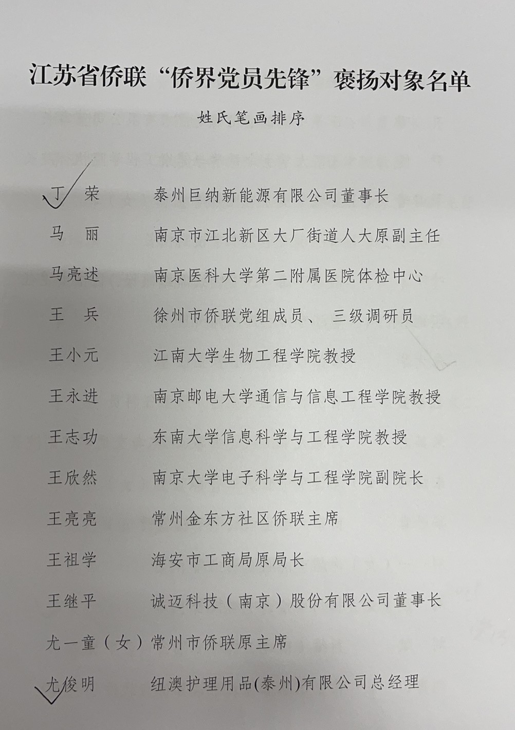 丁榮董事長(cháng)獲評為“江蘇省僑界黨員先鋒”